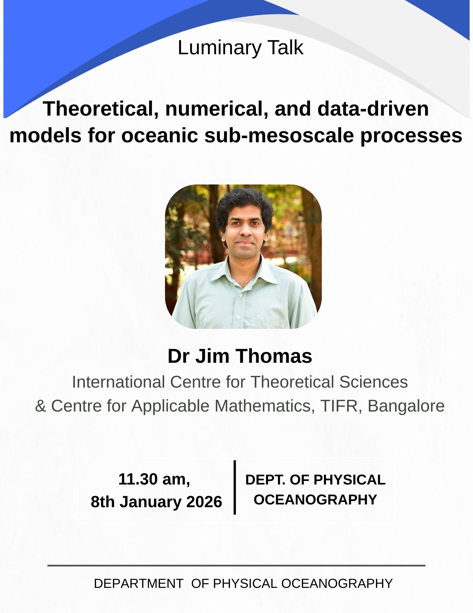 Eligibility: M Sc degree in Oceanography/Meteorology/ Marine Geology / Marine Geophysics /Physics/ Mathematics/ Climate Science/Earth Sciences/Space Physics/ or M.Sc. (Tech.)Degree in Marine Geophysics or B.E/ B Tech degree in Civil Engineering/Mechanical Engineering/Naval Architecture and Ship Building, Aeronautical and Aerospace Engineering/Environmental Science/ Environmental Engineering with a minimum of 60% marks or equivalent CGPA from any recognized University or Institution with preference to a valid GATE Score. A valid GATE score in any of the subjects mentioned above as the second paper. In the absence of applicants with GATE, others can also be considered on the basis of performance in Departmental Admission Test.